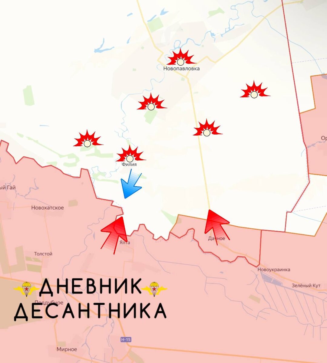 🪂 Днепропетровское направление. ВС РФ после многонедельных отражений атак противника все же закрепились на северных окраинах Дачного. Операторы БПЛА ВС РФ контролируют территорию с воздуха, для предотвращения контратак и перемещения вражеских групп. Со стороны Филии враг все также продолжает атаковать, в очередной попытке наши дроноводы уничтожили бронемашину ВСУ, которая выдвинулась по лесопосадке в направлении наших позиций. Преимущественно с нашей стороны идет работа по уничтожению врага в его тыловых районах, превентивные меры поддержки пехоте оказывают и авиация, и артиллерия ВС РФ. В Январском наши штурмовики закрепились и выбивают ВСУ. ВКС РФ авиаударом ликвидировали вражескую САУ у Сосновки. У Новосёловки четырьмя ФАБами накрыта лесопосадка с блиндажами противника. ▫️ Дневник Десантника