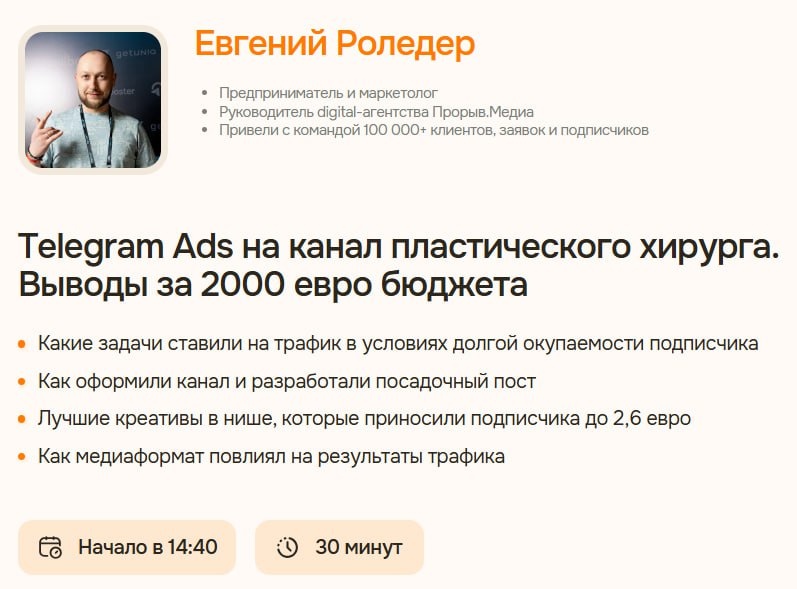 📳 Сегодня выступаю в эфире Telescope с кейсом: Telegram Ads на канал пластического хирурга. Выводы за 2000 евро бюджета Приходите, старт сегодня — 19 августа в 14:00. Эфир продлится около часа. Помимо меня будет еще Андрей Савостеев с кейсом: Продвижение канала нутрициолога с 3 000 до 8 200 и реклама на платный канал (вся экономика платника) Эфир бесплатный, польза бесценная. 🧡 Регистрируйтесь на конференцию по ссылке