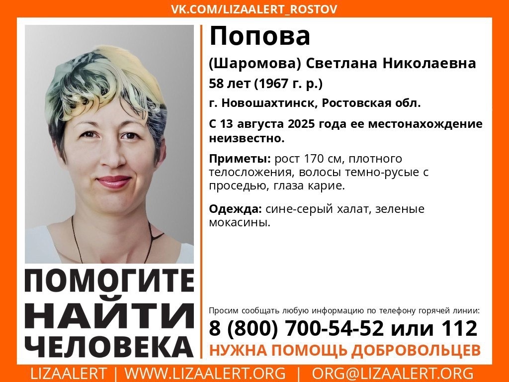 В Ростовской области близкие разыскивают Светлану Попову. С 13 августа о её местонахождении ничего неизвестно. Женщина покинула свой дом в Новошахтинске и никому не сообщила, куда направляется. Когда она не вернулась домой, родственники обратились в полицию. Позже к поискам присоединились волонтеры. Приметы Светланы Поповой: Была одета: Если вы знаете, где находится Светлана Попова или узнали её на фото, просьба немедленно сообщить по телефону: 8-800-700-54-52. Каждая деталь может помочь найти женщину!