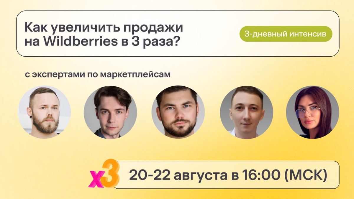 20-22 августа ждем всех на бесплатном интенсиве по росту продаж на WB. Топ-спикеры, актуальные стратегии, полезные гайды и розыгрыш 6 месяцев подписки на сервис аналитики - все это ждет участников уже на этой неделе! Как запрыгнуть в последний вагон подготовки к сезону высоких продаж и обеспечить себе самый прибыльный квартал в истории вашего бизнеса на WB? Присоединяйтесь к 3-дневному интенсиву от экосистемы для селлеров «Маяк»: 🔥 Как увеличить продажи на Wildberries в 3 раза? На бесплатном интенсиве топ-эксперты по маркетплейсам разберут все аспекты для кратного роста: от оформления карточки до настройки РК. Знакомьтесь с программой: 20 августа в 16:00 — «Секреты карточки, которая продаёт на миллион»