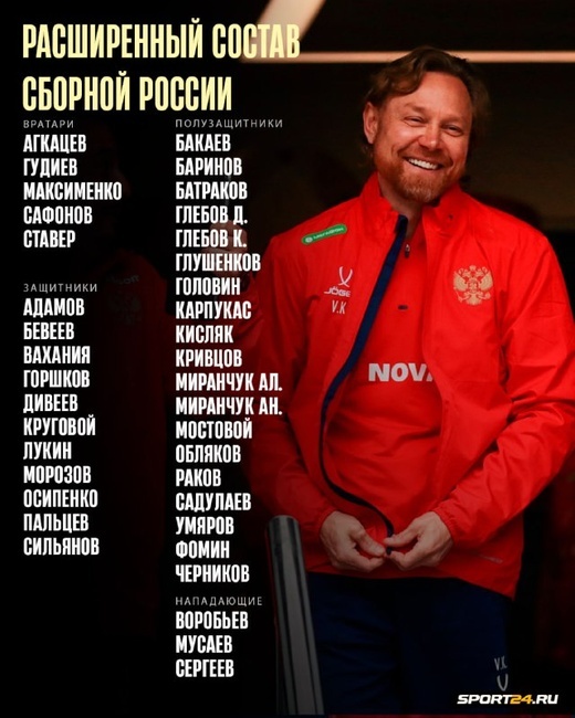 Карпин и Кафанов опубликовали расширенный список сборной России по футболу на сентябрьские матчи против Иордании и Катара. Вратарей выбирал Кафанов, а Карпин выбрал полевых игроков. Всего в списке 39 футболистов, то есть, он максимально широкий. Кто там присутствует? Вратари - 5: Сафонов (ПСЖ, Франция), Максименко (Спартак), Агкацев (Краснодар), Ставер (Рубин), Гудиев (Акрон). Центральные защитники - 5: Дивеев, Лукин (оба - ЦСКА), Морозов (Локомотив), Литвинов (Спартак), Осипенко (Динамо Москва). Фланговые защитники -7: Центральные полузащитники - 8: Баринов, Карпукас (оба - Локомотив), Фомин, Д. Глебов (оба - Динамо Москва), Кисляк (ЦСКА), Умяров (Спартак), Кривцов, Черников (оба - Краснодар). Атакующие полузащитники - 6: Ал. Миранчук (Атланта Юнайтед, США), Ан. Миранчук (Сьон, Швейцария), Головин (Монако, Монако/Франция), Обляков (ЦСКА), Глушенков (Зенит), Батраков (Локомотив). Вингеры -5: К. Глебов (ЦСКА), Мостовой (Зенит), Раков (Крылья Советов), Садулаев (Ахмат), Бакаев (Ло