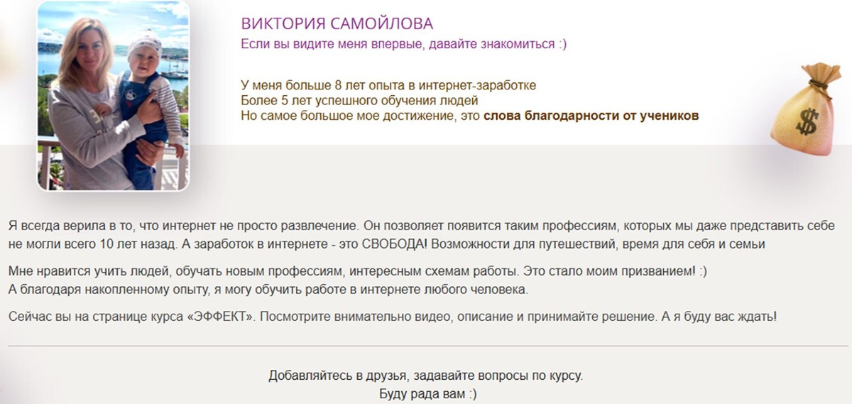 В сети всё чаще появляются «волшебные методики» по быстрому заработку. На этот раз внимание привлек курс «Эффект» от девушки по имени Виктория Самойлова. Она обещает ученикам доход от 28 до 150 тысяч рублей всего лишь на… копировании новостей. Звучит заманчиво, но есть ли в этом реальность? ✅ Кстати, проверенный метод заработка здесь ◀️ Слоган звучит громко: «Заработок до 130 000 рублей в месяц на постинге новостей». Схема проста: находишь свежую новость → выкладываешь в соцсети или на сайт заказчика → получаешь деньги. Стоимость курса — 2200 рублей. За эти деньги ученикам предлагают: Оплата обещана на карты, ЮMoney и Qiwi. Но никаких гарантий и документов, подтверждающих окупаемость, нет. Лицензии на образовательную деятельность — тоже. Вот тут начинаются вопросы. О Виктории нет достоверной информации: