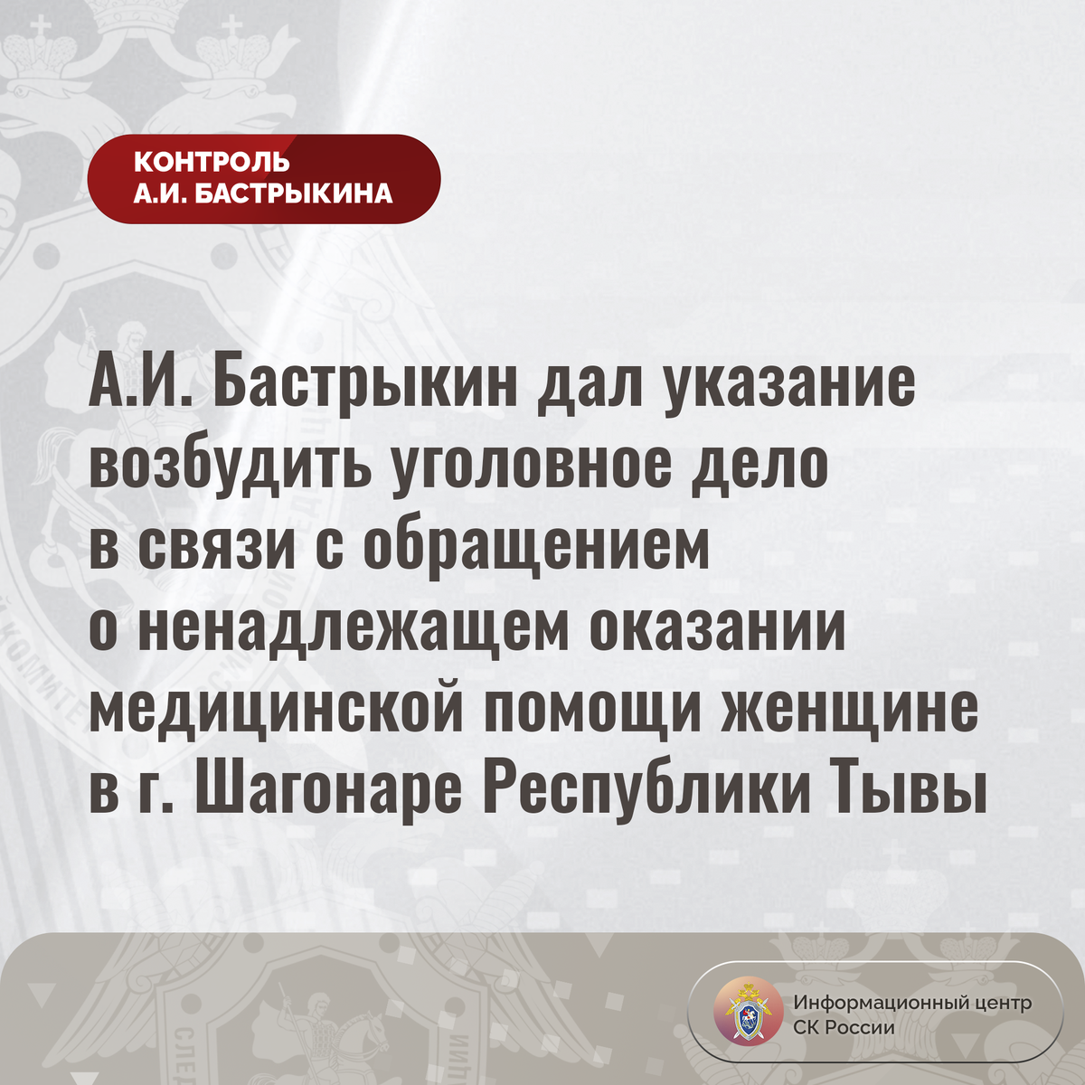 А.И. Бастрыкин дал указание возбудить уголовное дело в связи с обращением о ненадлежащем оказании медицинской помощи женщине в г. Шагонаре Республики Тывы