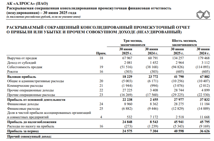 АЛРОСА опубликовала финансовые результаты по МСФО за I п. 2025 г. Отчёт получился противоречивым, с одной стороны компания просела по выручке и операционной прибыли, но выручка увеличилась, однако ей помогли разовые факторы и есть опасения, что ситуация во II полугодии не улучшится: 💎 Выручка: 134,3₽ млрд (-25,2% г/г),