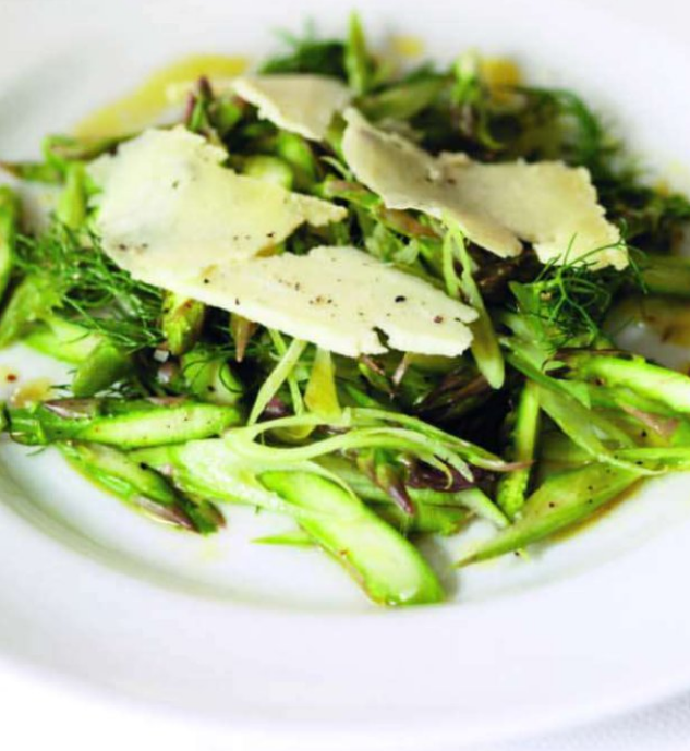 Время приготовления — 15 минут. 4 порции. Уровень сложности — лёгкий. Ингредиенты: Для приготовления салата: Для приготовления заправки: Отрежьте древесные концы спаржи и очистите нижнюю часть стеблей. С помощью мандолины или очень острого ножа нарежьте спаржу по диагонали на очень тонкие ломтики. Разрежьте луковицу фенхеля пополам и снова, используя мандолину или очень острый нож, нарежьте фенхель как можно тоньше. Положите его в миску со спаржей. Смешайте ингредиенты для приготовления заправки в банке с закручивающейся крышкой, добавьте соль и перец по вкусу и потрясите. Добавьте листья и перьевидные верхушки фенхеля к спарже и нарезанной луковице фенхеля и слегка приправьте. Разложите по тарелкам и перемешайте с заправкой. Натрите сыр небольшим острым ножом или овощечисткой и посыпьте салат.