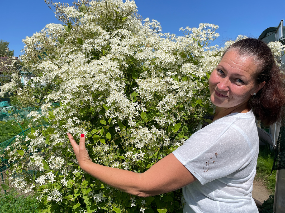 КЛЕМАТИС ВТОРОЙ ГРУППЫ ОБРЕЗКИ — ПОДГОТОВКА К СТРИЖКЕ! Этот клематис растет у меня уже более 15 лет на одном месте, так долго, что я даже забыла его название, но знаю, что он относится ко второй группе обрезки. Поэтому каждую осень я подстригаю его до 1,5 м, так как цветет клематис и на побегах прошлого года, и на побегах текущего года. Обрезка должна быть умеренной, чтобы сохранить прошлогодние побеги для раннего цветения. Стрижка произойдет осенью, в сентябре-октябре, в зависимости от погоды. После обрезки аккуратно сворачиваю побеги в кольцо и укрываю спанбондом до весны. Кормлю клематис вместе с розами, каждые две недели чередуя органику с минералкой. Обратите внимание, что в конце августа убираем все азотные удобрения и оставляем калийно-фосфорные подкормки, чтобы не нарастал лишний листовой аппарат, а молодые побеги вызрели и ушли крепкими в зиму.