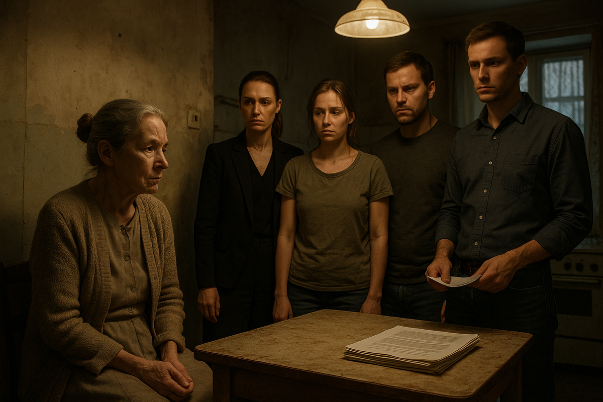 Людмила Андреевна крепче сжала ладони на коленях, будто пытаясь удержаться за привычную жизнь. Четверо её детей сидели напротив, за тем самым кухонным столом, где когда-то ели мамины котлеты и хвастались школьными отметками. Теперь они держали бумаги, выглядели деловыми и уверенными. Взрослые. Холодно решительные.