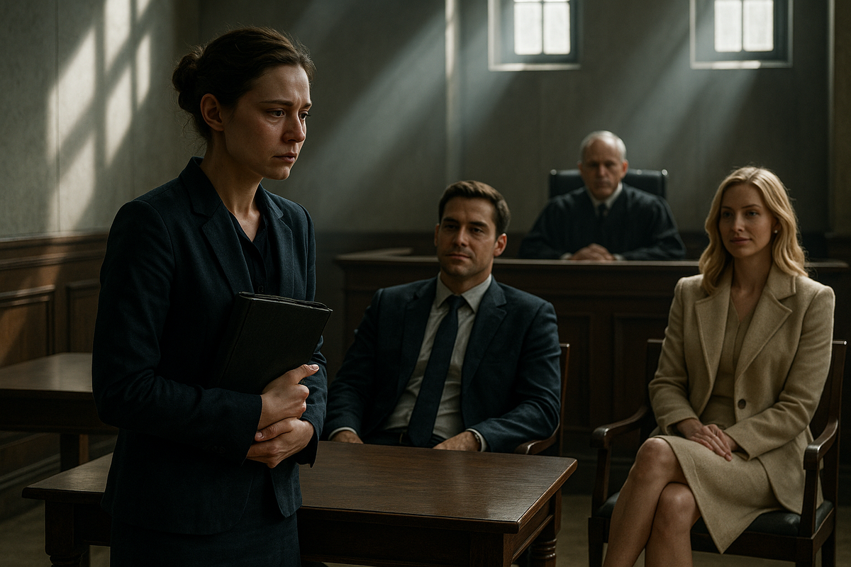 Суд. Холодный зал, строгий судья. Ирина с документами в руках, Сергей — уверенный, рядом с ним Маргарита в безупречном пальто.