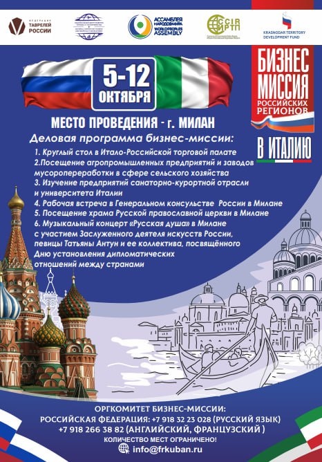 Агропромышленная бизнес-миссия регионов России в Италию С 5 по 12 октября 2025 года пройдет агропромышленная бизнес-миссия регионов России в Италию. Организатором бизнес-миссии выступили Фонд развития Краснодарского края и АНО «Национальный центр развития туризма и гостеприимства» при поддержке Почетного Генерального консула Италии в Краснодаре Пьерпаоло Лодиджиани, Итало-Российской торговой палаты, Ассамблеи народов мира и Федерации Таврелей России. В рамках деловой программы миссии делегаты посетят город Милан и ряд других итальянских регионов в целях обмена опытом и обсуждения вопросов сотрудничества в агропромышленной и технологической сферах, санаторно-курортной отрасли, экологии и утилизации отходов. Запланированы круглые столы с бизнес-сообществом, институтами поддержки, дипломатическим корпусом и представителями университетов. В завершении мероприятия при участии руководителя Культурного центра Фонда развития Краснодарского края, Заслуженного деятеля искусств России Татьяны Ан