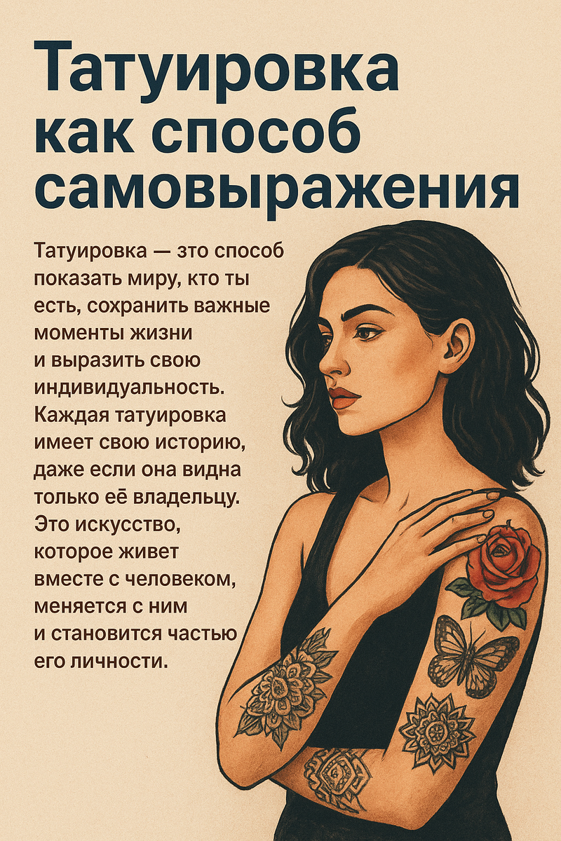 Татуировка — это больше, чем просто рисунок на коже. Это способ показать миру, кто ты есть, сохранить важные моменты жизни и выразить свою индивидуальность. Каждая татуировка имеет свою историю, даже если она видна только её владельцу. Это искусство, которое живет вместе с человеком, меняется с ним и становится частью его личности. Для многих людей тату — это символ силы и преодоления трудностей. Кто-то наносит на тело рисунок, напоминающий о пройденных испытаниях, кто-то — в честь любимого человека или события, которое навсегда изменило жизнь. Даже маленький знак на запястье может нести огромный смысл: память о путешествии, мотивация или просто источник вдохновения каждый день. Современные стили тату поражают разнообразием. Реализм позволяет запечатлеть портреты или сцены с невероятной точностью. Акварельные тату с мягкими переходами цветов напоминают картины на холсте. Геометрические узоры, абстракция и минимализм создают чистую и строгую эстетику, а трайбл и этнические мотивы несут