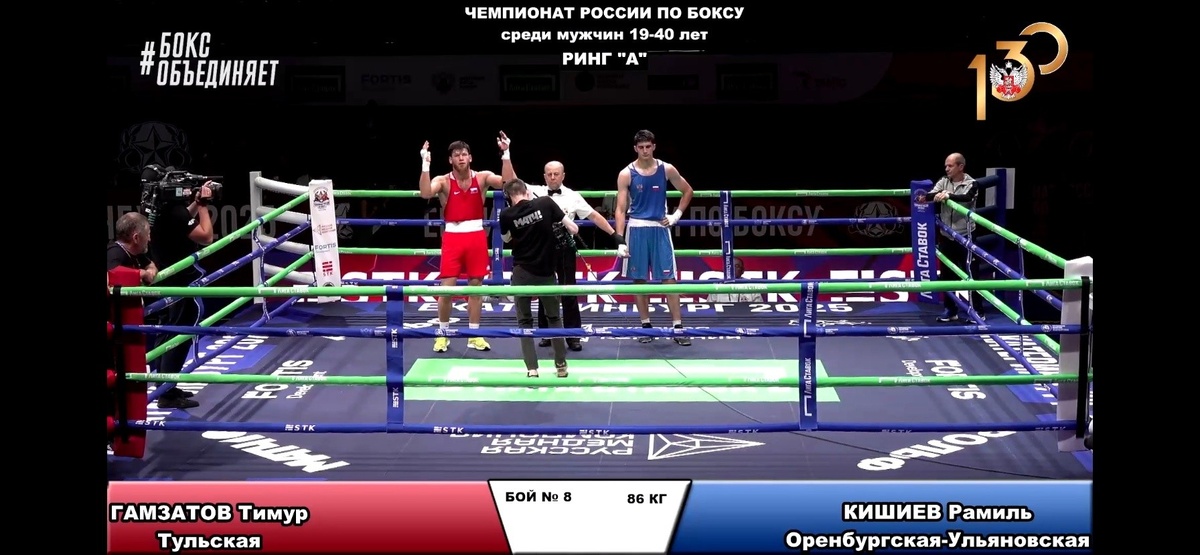 Боксёр из Тульской области Тимур Гамзатов вышел в четвертьфинал проходящего в Екатеринбурге чемпионата России. Во вторник, 19 августа, в своём первом бою в 1/8 финала в весовой категории до 86 килограммов Тимур Гамзатов единогласным решением судей по очкам победил Рамиля Кишиева, представляющего Оренбургскую область. Таким образом, тульский боксёр вышел в четвертьфинал чемпионата России, где встретится с боксёром из Омской области Ильёй Богатырёвым. Этот бой за выход в полуфинал состоится уже завтра – в среду, 20 августа. Второй представитель Тульской области – выступающий Джамбулат Бижамов уже выиграл два боя на проходящем чемпионате России в «своей» весовой категории до 80 килограммов и вышел в четвертьфинал турнира. В сегодняшней вечерней программе в поединке за полуфинал он выйдет на ринг против Данила Шенхнета из Свердловской области. Напомним, чемпионат России по боксу среди мужчин проходит в Екатеринбурге с 15 августа. За восемь дней соревнований здесь разыгрываются 13 комплекто