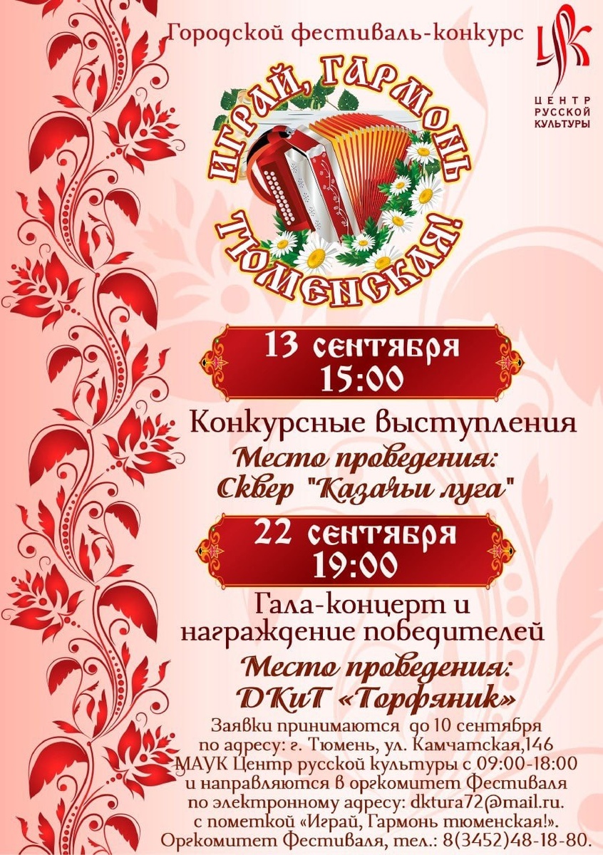 Внимание, Тюмень! Приглашаем творческие коллективы и сольных исполнителей принять участие в городском фестивале «Играй, гармонь тюменская» — празднике музыки и народной культуры! Ждём всех, кто живёт и творит в Тюмени и любит звучание родной гармони. Конкурсный день пройдёт 13 сентября в уютном сквере Казачьи луга по адресу: ул. Домостроителей, 22, корп. 2. Начало – в 15:00. А финальный аккорд — гала-концерт и награждение победителей — прозвучит 22 сентября в 19:00 в концертном зале ДКиТ «Торфяник» на ул. Малышева, 26. Присоединяйтесь к музыкальному празднику и покажите, как звучит настоящая тюменская гармонь! Подробности в положении.