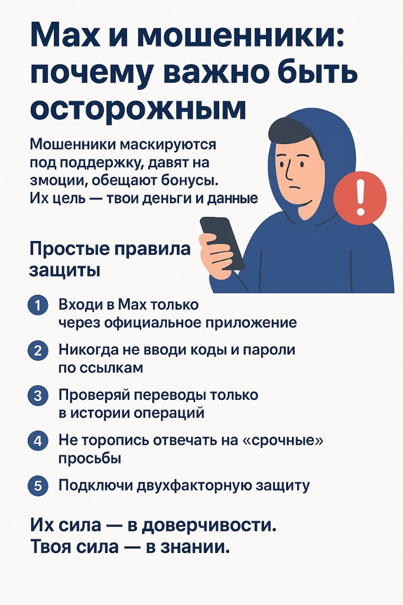 MАХ — это не просто мессенджер. Это твой кошелёк, документы, доступ к услугам. И именно поэтому он стал полем охоты для мошенников. Каждый, кто использует MАХ, автоматически становится их целью. Вопрос не «нападут ли», а «когда». Как действуют мошенники Подделка доверия. Они маскируются под техническую поддержку или знакомого друга. Ты видишь привычный логотип — и рука тянется нажать. Игра на эмоциях. «Срочно верни перевод», «подтверди аккаунт иначе его заблокируют». Давление времени и страх потери — самые сильные крючки. Обещание выгоды. Лёгкие бонусы, скидки, быстрый заработок. На этом ловят тех, кто хоть на минуту расслабился. Что важно понять Мошенники всегда играют на доверии и эмоциях. Но у тебя есть то, чего нет у них — знание. И именно знание превращает обычного пользователя в того, кого не обманешь. Простые правила защиты 1. Входи в MАХ только через официальное приложение. 2. Никогда не вводи коды и пароли по ссылкам. 3. Проверяй переводы только в истории операций, а не по соо