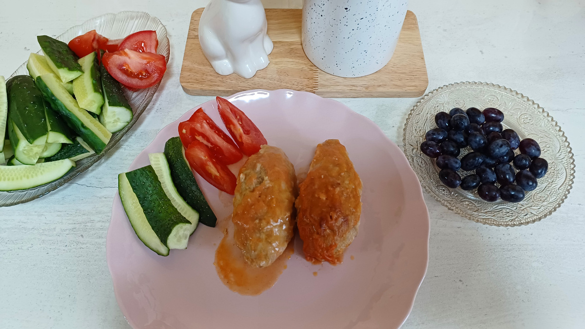 Также приготовила салат из помидоров, огурцов и пекинской капусты.