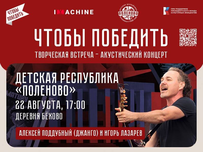 Дорогие друзья! Уже 22 августа гостями лагеря «Детская Республика «Поленово» станут Алексей Поддубный (Джанго), певец, композитор, общественный деятель, а также музыкант, гитарист коллектива Игорь Лазарев. Они проведут творческую встречу - акустический концерт, где артисты обязательно пообщаются со зрителями, расскажут интересные истории из музыкальной жизни, поделятся опытом, вспомнят поездки на Донбасс, наших бойцов. Обязательно все вместе мы споем песни Джанго! Выступление в Республике станет частью концертно-просветительского движения “Чтобы победить”, который проходит в городах России при поддержке Президентского фонда культурных инициатив и Министерства Обороны РФ. ⏰Начало творческой встречи в 17:00.