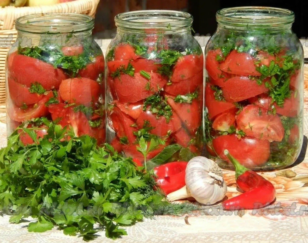 - Подготовка. Банки и крышки тщательно вымойте с содой и простерилизуйте. Помидоры вымойте, обсушите и разрежьте на 4-6 долек (в зависимости от размера). Чеснок очистите и измельчите. Петрушку крупно порубите. Смешайте дольки помидоров с чесноком и зеленью.