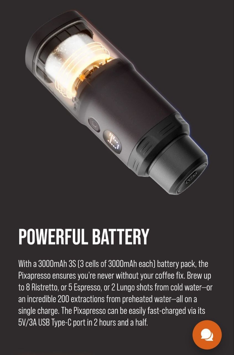 Wacaco представила Pixapresso — карманную кофемашину в виде термоса. Вес меньше килограмма, помещается в любой рюкзак и готовит кофе как из капсул, так и из молотого. Полного заряда хватает на пять порций, одна чашка варится за 180 секунд. Цена гаджета — $160 (около 12 800 рублей).
