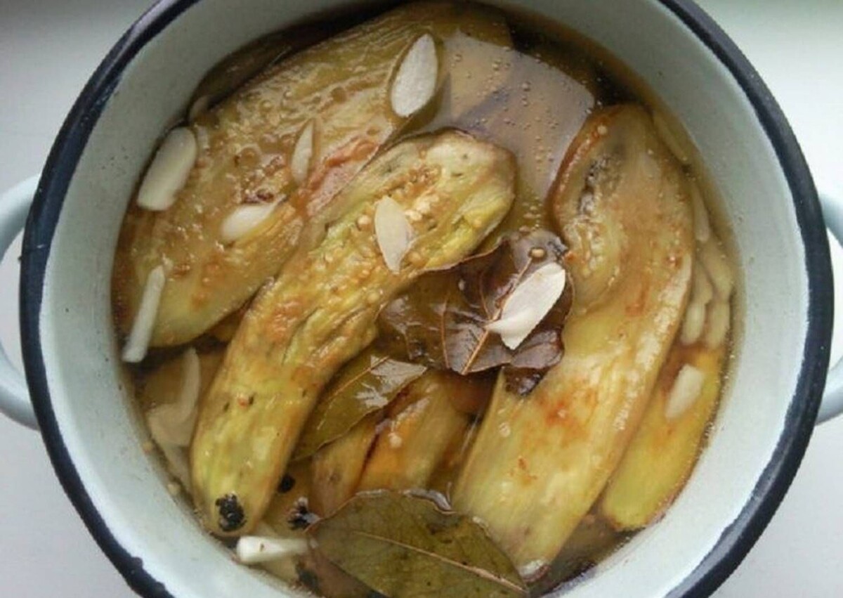 - Укладка. Укладывайте баклажаны слоями в подходящую емкость (контейнер, глубокая миска или кастрюля), пересыпая каждый слой нарезанным чесноком.