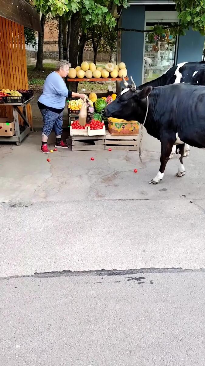 В Сосновом Бору утром прохожие заметили двух любопытных буренок, которые так и норовили продегустировать выставленные на продажу фрукты и овощи. Коров отгоняла женщина с сумкой. Судя по тому, как одна из парнокопытных что-то сосредоточенно пережевывала, она, вероятно, уже успела что-то прихватить. Видео поделились очевидцы в сообществе "Мой Сосновый Бор" во "ВКонтакте". "Утро в Сосновом Бору", - отметил автор публикации. В комментариях пользователи социальной сети восхитились смелостью женщины с сумкой. По словам горожан, буренки к обеду ушли к школе. Позднее появилось еще видео с коровами, на котором также запечатлен ажиотаж, который они вызвали своим появлением. В этот раз животные ни на что не покушались, а мирно паслись. "То лошади убегают, то коровы прямо на дороге", - подмечают сосновоборцы.