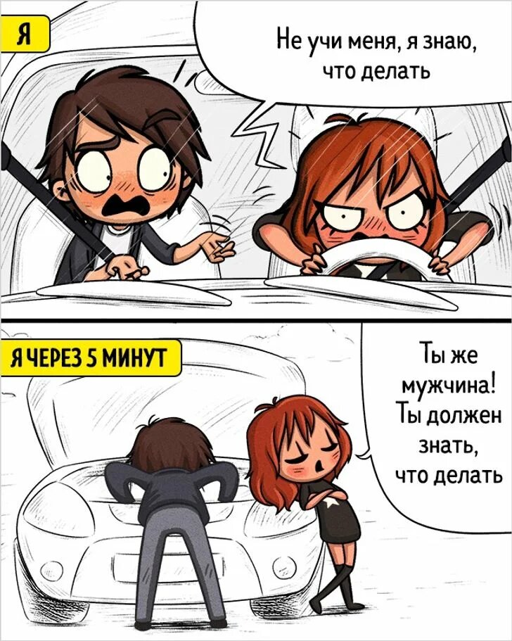 На верхнем рисунке, где девушка за рулём, она, похоже, забыла, как совсем недавно они сидели в кафе с подругой, которая жаловалась ей на своего безвольного мужа, неспособного что-то дельное подсказать в критической ситуации, заставляя всё время бедную жену брать инициативу в свои руки… Как мне повезло с мужем, думала она тогда, жалея свою невезучую подругу… Ну а на рисунке, расположенном под верхним, она, вероятно, снова поняла, какой у неё привлекательный, умный, рукастый, парень; вспомнила про подругу, но по какой-то таинственной и непонятной ей самой причине почему-то в этот раз её не пожалела, а лишь злорадно усмехнулась...