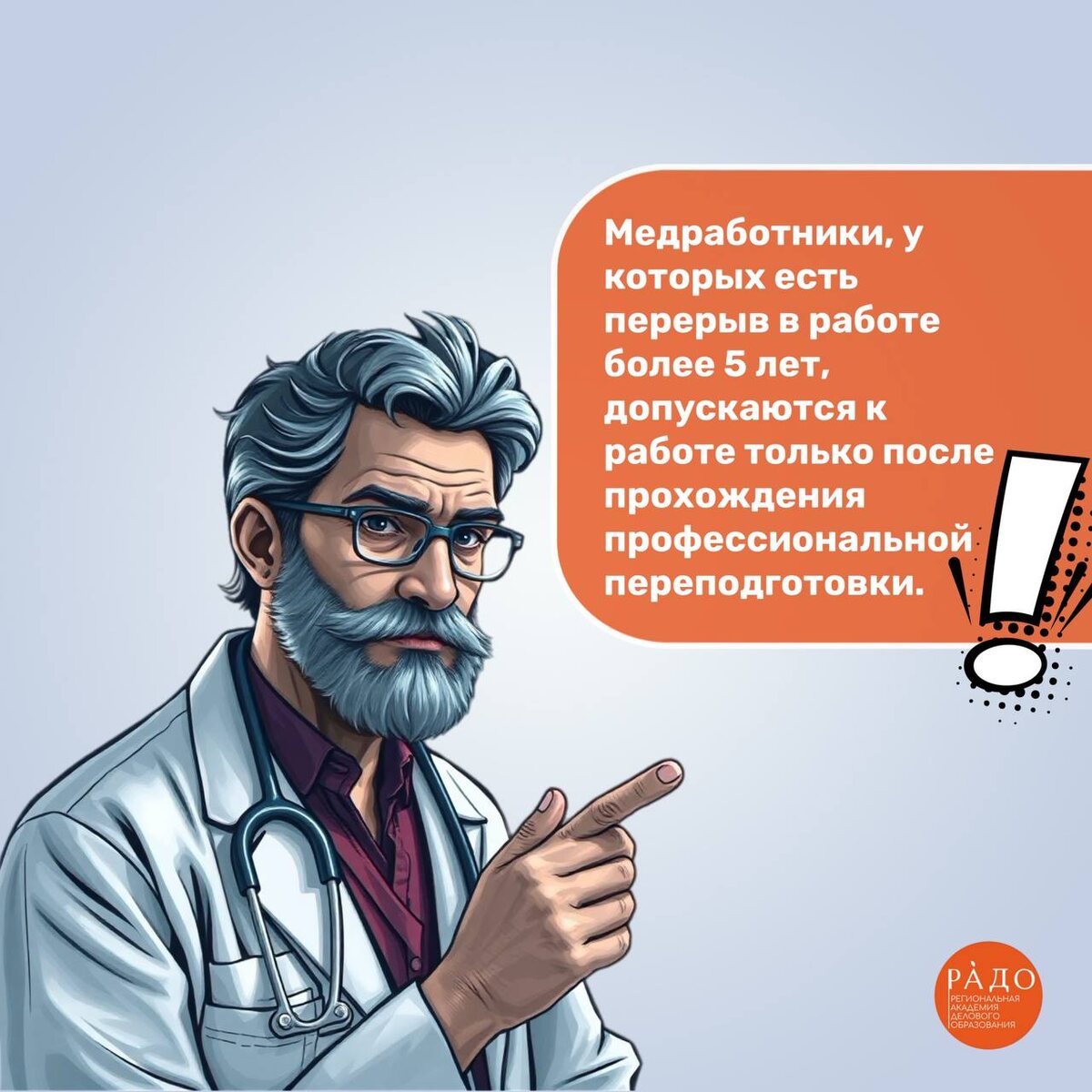 Медработники, у которых есть перерыв в работе более 5 лет, допускаются к выполнению профессиональных обязанностей только после прохождения профессиональной переподготовки. Профессиональная переподготовка необходима в следующих случаях: ✅Медработник работал по другой специальности. Если в течение 5 лет медработник не работал по одной из специальностей, для возвращения в профессию ему необходимо освоить программу профессиональной переподготовки. ✅Медработник не был официально трудоустроен. Профессиональная переподготовка нужна, если специалист фактически работал в сфере медицины, но в трудовой книжке нет соответствующей записи. ✅Должность в трудовой книжке не соответствует установленной номенклатуре. Медицинские должности перечислены в приказе Минздрава №206н (для врачей) и 83н (для СМП). Для допуска к работе медработник после профессиональной переподготовки обязан пройти первичную специализированную аккредитацию. Нужно подать документы в региональный аккредитационн