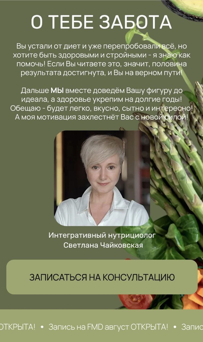 ⭐️ ТЕПЕРЬ ЕЩЁ И САЙТ ЗАРАБОТАЛ ДЛЯ ВАШЕГО УДОБСТВА! ⬇️ЗАХОДИТЕ ПО ССЫЛКЕ⬇️ https://otebezabota.ru/ 🔸 На сайте есть подробная информация обо мне, о том, чем я могу профессионально помочь, а также - в каких случаях не берусь работать с клиентом. 🔸 Увидите ФОТО моих реальных клиентов ДО и ПОСЛЕ, которые дали согласие для размещение на сайте, к сожалению, не каждый клиент готов делиться своими преображениями публично, но - поверьте - в моей практике их уже стало много и я благодарна каждому за доверие! 🔸 А вот ОТЗЫВЫ мои клиенты охотно оставляют и это очень приятно, так как это помогает другим поверить в себя и решиться на здоровое преображение с моей помощью! 🔸 Кстати, ОТЗЫВЫ участников, прошедших групповой FMD, там тоже есть - прочитайте! Это интересно! Узнаете какие трансформации происходят с моими любимыми клиентами! 🔸 На сайте, также, можно записаться на консультацию, и - также как на ТГ канале - МОЖНО ОПЛАЧИВАТЬ протокол FMD! 🔶 И, кстати, вы еще успеваете на прото