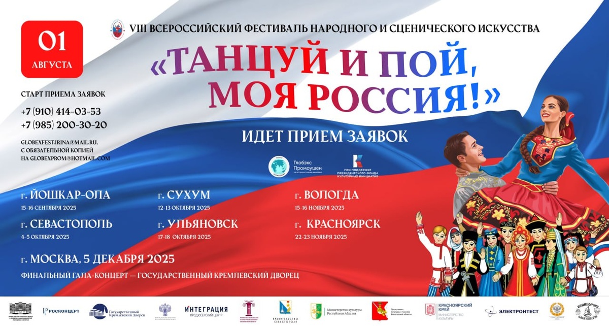 Один из отборочных этапов фестиваля «Танцуй и пой, моя Россия!» пройдет в Марий Эл К участию в VIII Всероссийском фестивале народного и сценического искусства «Танцуй и пой, моя Россия!» приглашаются профессиональные и полупрофессиональные коллективы народного и сценического искусства по направлениям: вокал, танец, инструментал, хоровое пение, военно-патриотическая песня. Региональный отборочный этап в Йошкар-Оле пройдет 5-16 сентября в Марийском государственном театре оперы и балета имени Эрика Сапаева. Остальные отборочные этапы пройдут в Севастополе, Сухуме, Ульяновске, Вологде, Красноярске. Гала-концерт VIII Всероссийского фестиваля народного и сценического искусства «Танцуй и пой, моя Россия!» пройдет 5 декабря в Государственном Кремлевском дворце. Фестиваль проходит при поддержке Президентского фонда культурных инициатив и ФГБУК «Росконцерт».
