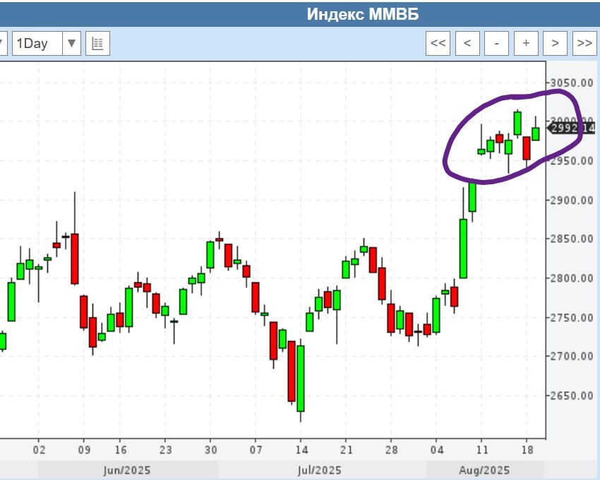 По рынку акций, сегодня у нас рост. В целом рынок продолжает консолидироваться на хаях. Ситуация очень похожа на ту, что была в декабре на прошлом росте "под мир", тогда тоже был момент консолидации, когда бумажки вели себя похожим образом. Тут главное не окатывать, что рынок и делает. А в сентябре до которого осталось недолго у нас ещё понижение ставки от ЦБ.
