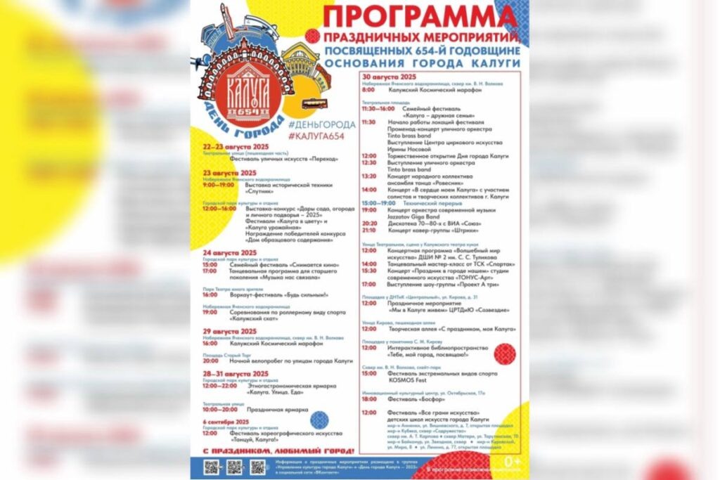 Калуга готовится к празднованию 654-й годовщины основания города. В этом году программа обещает быть особенно насыщенной: фестивали, концерты, выставки, спортивные события и гастрономические ярмарки. Основные торжества пройдут с 22 августа по 6 сентября, а кульминацией станет праздничный день 30 августа. Мы собрали для вас полную афишу мероприятий, чтобы вы смогли заранее спланировать своё участие. Фестиваль уличных искусств «Переход»