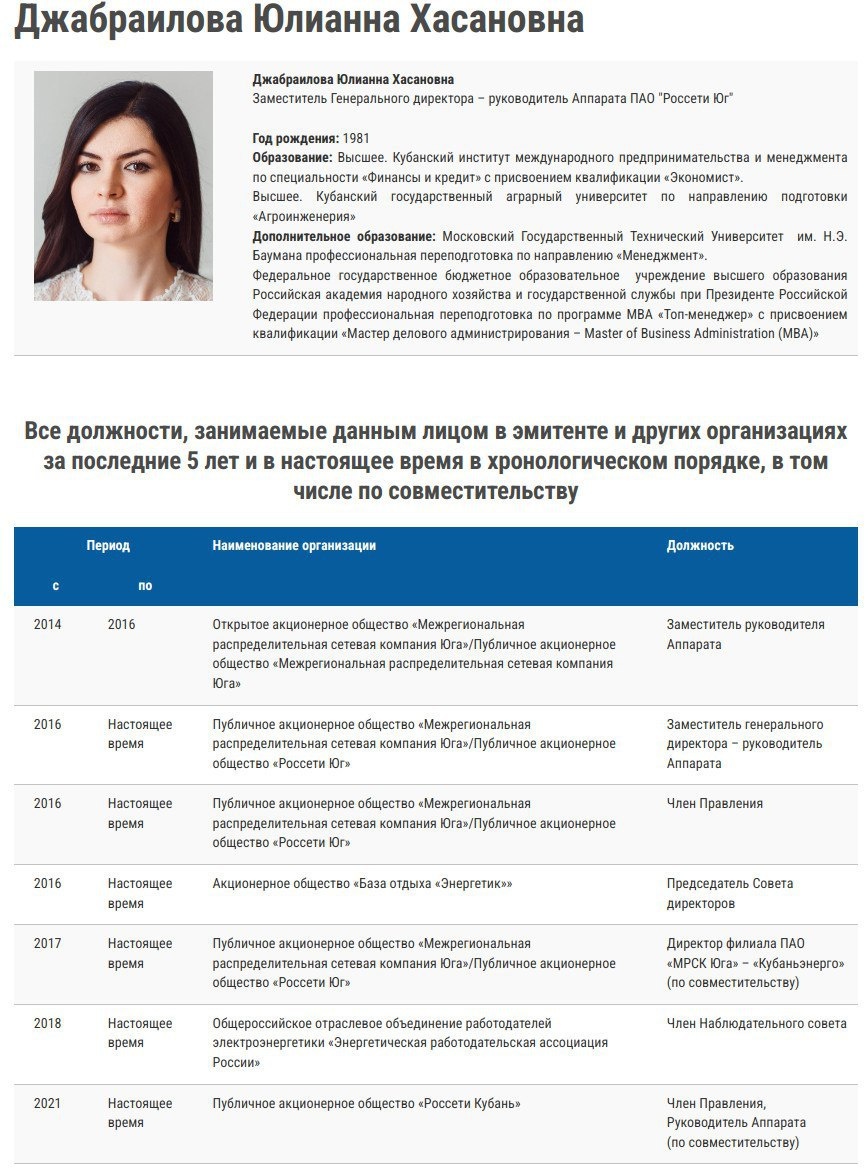 Редакции «Компромат Групп» стали известны новые обстоятельства, проливающие свет на провалы кадрового блока ПАО «Россети Юг», систематически попадающего в сводки «Ростехнадзора» и регионального управления ФАС. В распоряжении редакции имеются материалы, свидетельствующие о том, кто именно отвечает за работу с персоналом и как эта должность используется для перераспределения финансовых потоков внутри компании. С 2014 года, а с 2016 года уже в ранге заместителя генерального директора – руководителя аппарата, ключевой фигурой здесь является Юлианна Джабраилова. За годы работы она «прославилась» не только постоянным лоббированием роста управленческих расходов (с 570 млн руб. в 2014 году до 1,1 млрд в 2024-м), но и собственными скандальными выходками, попавшими в федеральные новости. Видео с хамской манерой вождения и нарушениями ПДД лишь подтверждает уровень личной культуры руководителя, при том, что транспортная служба компании находится в её же подчинении. Особый цинизм ситуации в том,