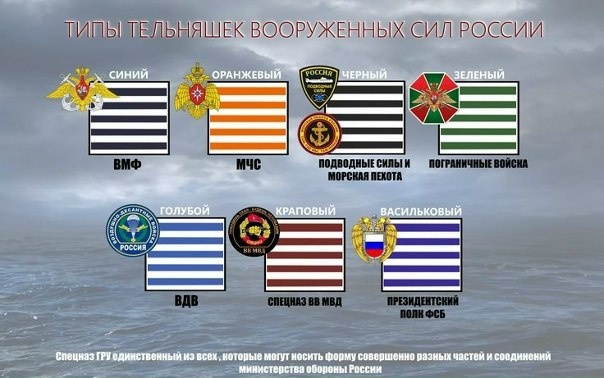 По аналогии с формой морской пехоты, тельняшку в 1969 году ввели в экипировку воздушно-десантных войск Советской армии. Эта тельняшка небесной гвардии стала "небесной", светло-синего цвета. Спецназ ГРУ получил такую же - морские части спецназа ГРУ носят военно-морскую форму и, соответственно, черно-белую морскую тельняшку. Российские морские пограничники надели в 1893 году флотскую тельняшку с синими полосами. После революции морские пограничники носили такие же тельняшки, как и моряки ВМФ. В 90-х годах прошлого века были разработаны тельняшки для других родов войск: зеленые (погранвойска), краповые (спецназ ВВ), васильковые (спецназ ФСБ, Президентский полк), оранжевые (МЧС), морская пехота и подводники - чёрные. В общем, с праздником тех, кто носил тельняшки❗❗❗ (я вот носил)