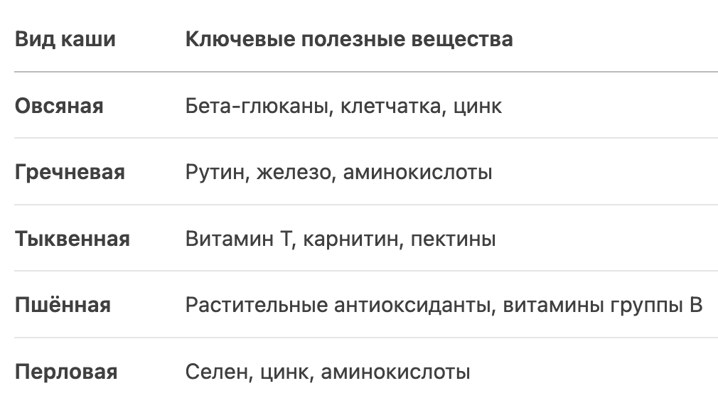 Таблица: Сравнение питательной ценности каш для здоровья печени