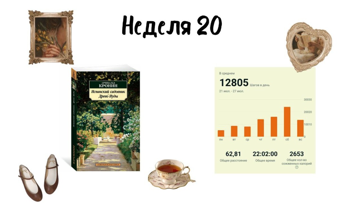 Неделя 20 (140 дней) 📚🤎🤎🤎🤎🤎 Арчибальд Кронин "Испанский садовник" и "Древо Иуды" Рассказала о книге здесь в кружочках. 🤎🤎🤎🤎🤎🤎🤎🤎🤎🤎🤎 Тут было проблематично. У меня был острый приступ панкреатита, поэтому я физически себя сильно не напрягала первую половину недели, не ела почти двое суток, потом один раз в день. С пятницы вернула прогулки, зарядку. Сейчас боюсь что-то планировать, но хочется делать либо хорошую зарядку + мфр утром, либо растяжку в вечернее время. 🎀Будем посмотреть 🤎
