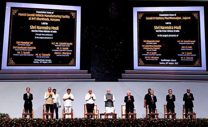Церемония закладки фундамента новых производственных мощностей состоялась в рамках мероприятия, проведённого в международном конференц-центре Махатма Мандир в ознаменование 40-летия Suzuki в Индии. В церемонии приняли участие премьер-министр Индии г-н Моди, главный министр штата Гуджарат г-н Патель и посол Японии в Индии г-н Сузуки, а главный министр штата Харьяна г-н Хаттар и исполнительный вице-председатель Maruti Suzuki India Limited (Maruti Suzuki) г-н Аюкава присутствовали онлайн со строительной площадки в Харходе. Президент г-н Сузуки Тошихиро, почетный президент г-н Сузуки Осаму и директор, а также старший управляющий г-н Сайто лично представляли корпорацию Suzuki, а со стороны дочерней компании Maruti Suzuki присутствовали председатель г-н Бхаргава и управляющий директор г-н Такеучи. Участники церемонии пожелали успехов в строительстве заводов, соблюдения сроков и норм безопасности.