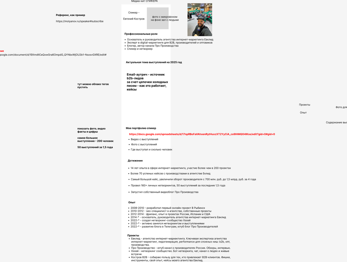 Потребовалось 2 месяца работы, фотограф, видеограф, куча собранной инфы, мои прототипы, дизайнер и верстальщик. Я даже объявил после всех тестирований и проверок, тестирование среди подписчиков в телеграм-канале. Если кто найдет ошибку - выплачу 1000 руб. Рассказываю подробнее. Во-первых, стоит рассказать, что свой первый персональный сайт ekostrov.ru я сделал где-то в 2012 году. Залил туда директ и заявки на seo-услуги просто посыпались. Я даже через 3 дня выключил рекламу. Во-вторых, стоит отметить, что домен kostrov.ru мне достался не за красивые глаза. Его предлагали купить за 1 млн. руб. на старте, но домейнер оказался другом в Facebook, сжалился надо мной и продал за 100к руб. В-третьих, делать себе сайт про себя – это ад. Кто пробовал, тот знает. Гораздо легче делать сайты другим. Кстати почему так? Как обычно все началось с разработки прототипов В концепции я увидел, что играю несколько профессиональных ролей. Это руководитель агентства, спикер, блогер и digital-эксперт, а такж