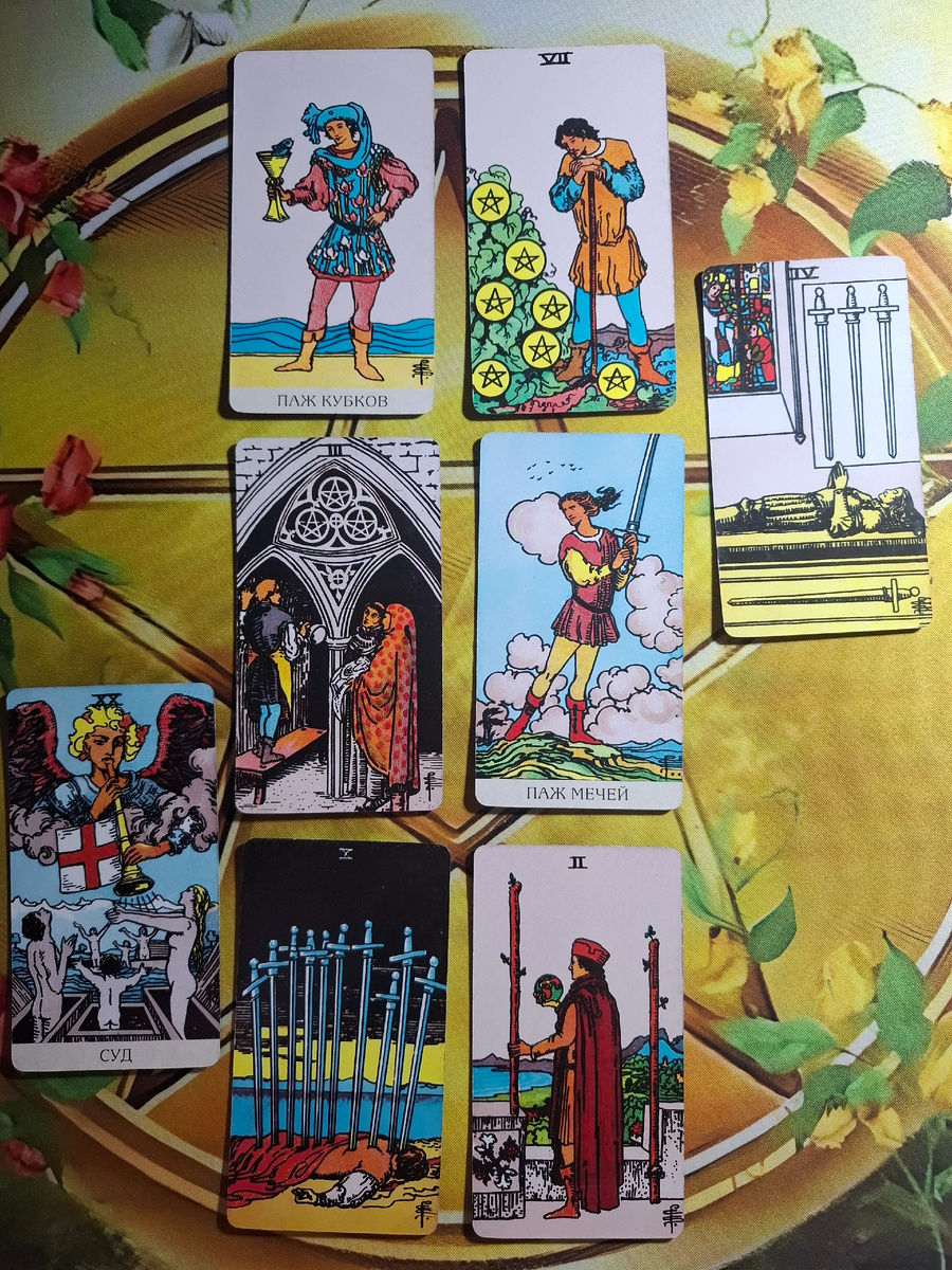Ваш расклад показывает, что перемены уже в пути – и они затрагивают все сферы жизни. Сначала приходит лёгкое вдохновение и новые эмоции (Паж Кубков), затем проявляются результаты прошлых усилий (7 Пентаклей), открываются возможности сотрудничества (3 Пентаклей) и обучения (Паж Мечей). Десятка Мечей указывает на завершение старого, а Двойка Жезлов – на новый горизонт и перспективы. Дополнительные карты Четвёрка Мечей и Суд подчёркивают: всё это идёт через паузу, осознание и пробуждение к новой жизни.