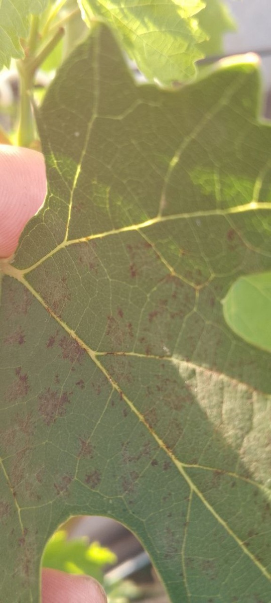 На самом деле, при определенном опыте, понять картину заболевания не сложно. Это на виноградном листе запущенный оидиум/мучнистая роса. Под словом "запущенный" понимается стадия, когда грибок уже поразил ткани листа настолько, что на нём появились явно видимые островки-кляксы некрозов. Проще оидиум определяется на виноградной лозе. Это характерные темные пятнышки, имеющие после обработок фунгицидами более видимую форму клякс.