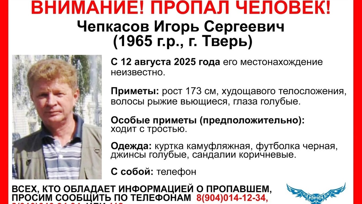 В Тверской области пропал Игорь Сергеевич Чепкасов 1965 года рождения. Как сообщает тверской волонтерский поисково-спасательный отряд "Сова", с 12 августа 2025 года его местонахождение неизвестно.