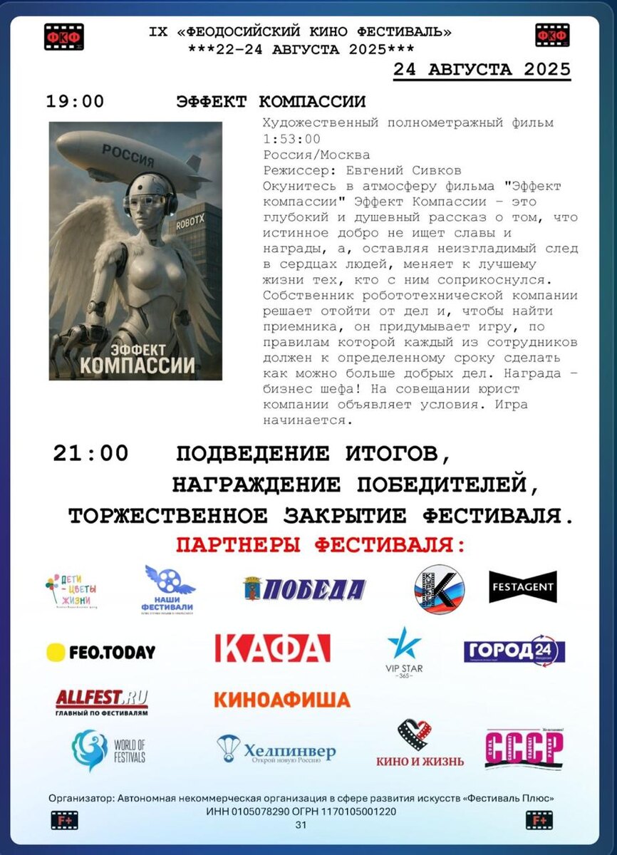 🎬 IX «ФЕОДОСИЙСКИЙ КИНО ФЕСТИВАЛЬ» 2025 📅 С 22 по 24 августа в Феодосии пройдет главный кинокарнавал Крыма – IX Феодосийский кинофестиваль! Три дня – десятки фильмов, живые дискуссии и атмосфера настоящего праздника кино. ✨ Что ждет гостей: 63 конкурсные работы из России, Беларуси и Узбекистана; фильмы из Москвы, Петербурга, Бреста, Ташкента, Магадана и других городов; встречи с режиссерами и актерами, обсуждения фильмов и экспертные комментарии; торжественное открытие – 22 августа в 10:00; церемония закрытия – 24 августа в 21:00. 📍 Локация: отель «Грей ИНН», зал «Цивилизация» Адрес: г. Феодосия, проспект Айвазовского, 45-В 🕙 Показ фильмов: с 10:00 до 22:00 🎥 Это шанс увидеть новое кино, почувствовать энергетику творческого сообщества и стать частью кинематографической истории. 👉 Подробности и программа: crimeafestivalplus.com ☎️ Тел.: +7 (918) 226-50-22 📧 E-mail: crimeafestivalplus.com@gmail.com
