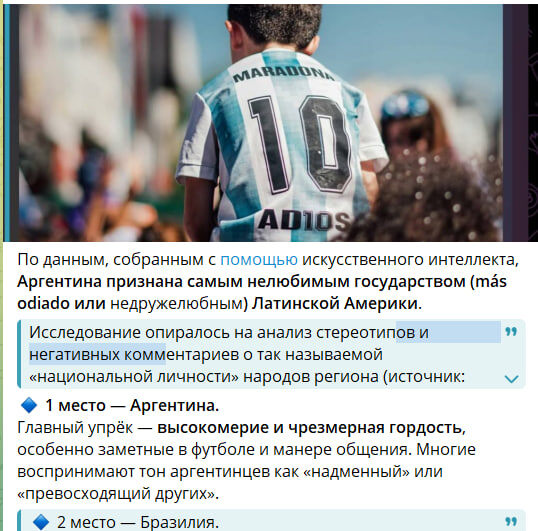 По данным, собранным с помощью искусственного интеллекта, Аргентина признана самым нелюбимым государством (más odiado или недружелюбным) Латинской Америки. Исследование опиралось на анализ стереотипов и негативных комментариев о так называемой «национальной личности» народов региона 🔹 1 место — Аргентина. Главный упрёк — высокомерие и чрезмерная гордость, особенно заметные в футболе и манере общения. Многие воспринимают тон аргентинцев как «надменный» или «превосходящий других». 🔹 2 место — Бразилия. Причина неприязни — ощущение чрезмерной раскованности и навязчивости в поведении, а также шумность и излишне свободная манера общения.