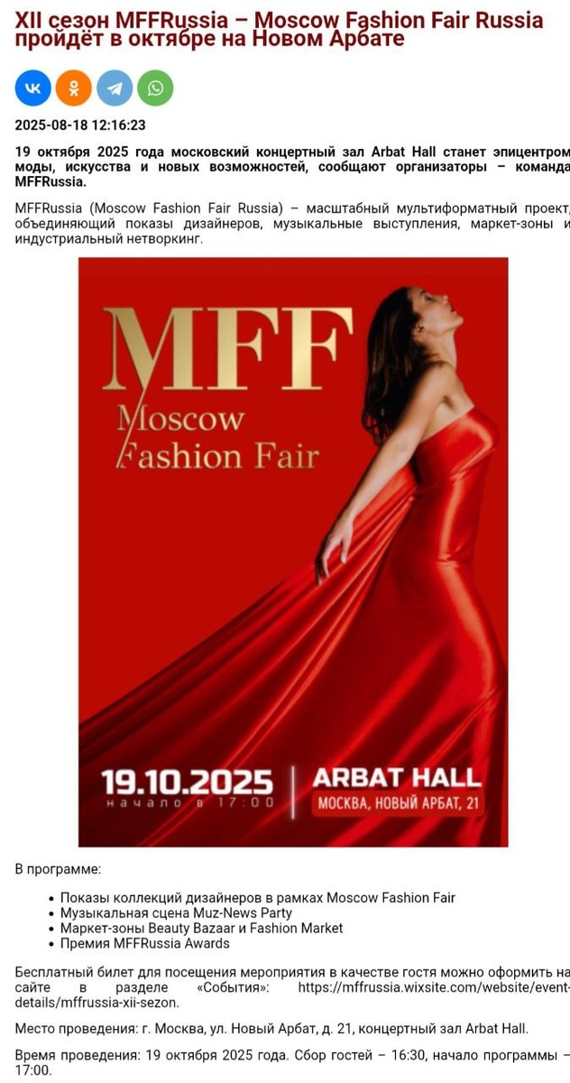 XII сезон MFFRussia – Moscow Fashion Fair Russia пройдёт в октябре на Новом Арбате - Новости - Информационное агентство РИА МОДА https://riamoda.ru/news/63752.html