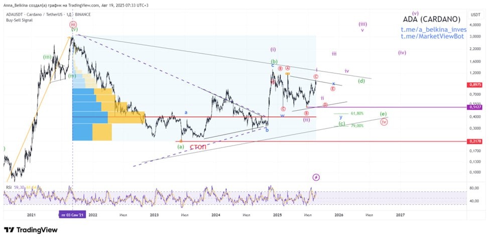 #ADA #НеСкам Помимо основного варианта с глобальным незавершенным треугольником, хочу вернуть вариант с завершенным треугольником (фиолетовый пунктир) и формирование заходной на монете, потому как здесь он может иметь хорошие шансы на реализацию. Сейчас формируется сетап в волне ii of (iii), стоп по завершению второй волны (ii) на USDT 0.5127. Интересно будет попробовать сетап с близким стопом.с Если же треугольник еще в развитии, то здесь волна x of (c) of [iv] может принять вид бегущего треугольника или бегущей плоскости. Очень хорошо по структуре сейчас ложится вариант с завершенной бегущей плоскостью с выходом вниз в волну y of (c) of [iv]. По этой гипотезе стоп по-прежнему на завершении волны (а) треугольника, сетапа пока нет. Не является ИИР 💪 Бот Закрытого Канала (подписаться из-за границы, пишите личным сообщением)