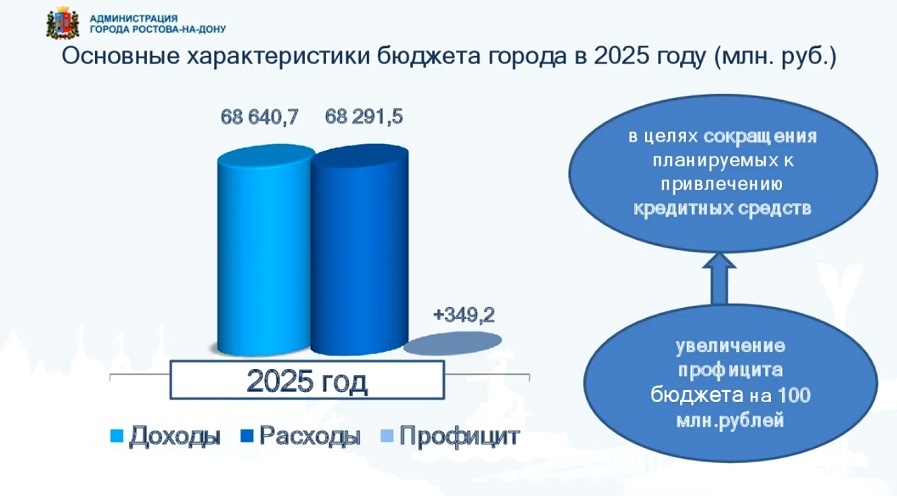 Изменения коснулись бюджетов на 2025, 2026 и 2027 годы. Согласно докладу замглавы администрации Ростова-на-Дону – начальника муниципального казначейства Татьяны Асатрян, доходная часть бюджета в 2025 году увеличена на 1 млрд 157,7 млн рублей. Часть этой «прибавки» – от безвозмездных поступлений бюджетов более высокого уровня – 524,1 млн рублей. Еще 633,6 млн рублей добавил рост собственных налоговых, неналоговых и прочих доходов. При этом большая часть доходов бюджета (39 млрд 253,8 млн) по-прежнему складывается из безвозмездных поступлений. Бюджет на 2025 год. Скриншот видеотрансляции заседания гордумы В целом в 2025 году доходы городского бюджета составят 68 млрд 640,7 млн рублей, а расходы – 68 млрд 291,5 млн рублей. Профицит – 349,2 млн рублей. Дополнительные расходы бюджета пойдут на социальную сферу, дорожное хозяйство и транспорт, ЖКХ. В строке «социальная сфера» наибольшие дополнительные расходы (438 млн) предусмотрены на оснащение оборудованием, мебелью, учебными пособиями (по