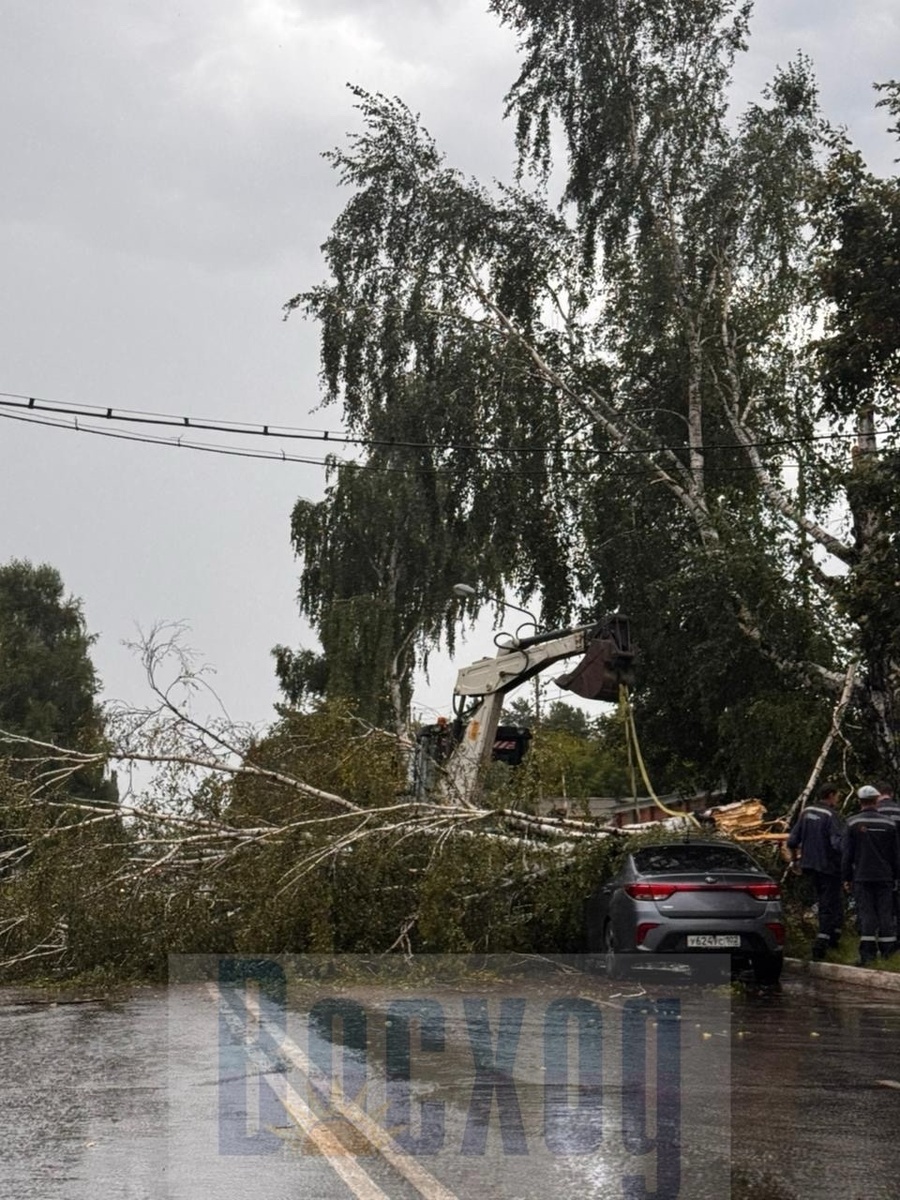 Недалеко от ЗАГСа огромная берёза не выдержала порыва и рухнула прямо на дорогу. Под её тяжёлые ветви попала припаркованная машина.