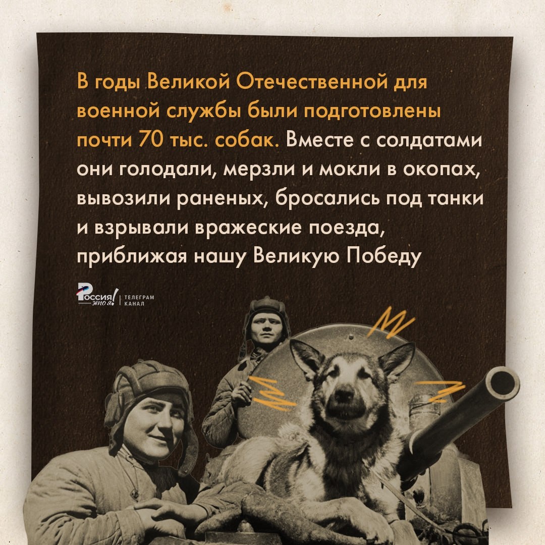 Сегодня — День фронтовой собаки!🐕 Эти верные и смелые четвероногие друзья прошли огонь и воду, защищая нашу Родину в тяжелые годы Великой Отечественной войны. Их преданность и смелость вдохновляли людей и становились примером безусловной верности. Сегодня собаки на фронте по-прежнему незаменимы и помогают бойцам СВО в самых сложных условиях. Больше интересных фактов о том, чем занимались собаки во время Великой Отечественной войны, вы найдете на наших карточках! 🇷🇺 Подпишись на «Россия — это я!»