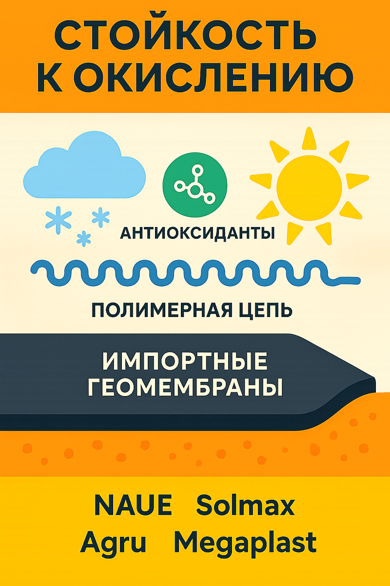 Важность устойчивости геомембран к окислению. Важность стойкости геомембраны к окислению и роль импортных качественных материалов на российском рынке Геомембраны — незаменимый элемент гидроизоляционных систем, применяемых в строительстве водохранилищ, навозохранилищ, промышленных резервуаров и других инженерных сооружений. Одним из ключевых факторов, определяющих долговечность и надежность геомембраны, является ее стойкость к процессу окисления. Особенно высокие требования предъявляются к материалам, используемым в России, где климатические условия, агрессивные среды и эксплуатационные нагрузки требуют по-настоящему качественной продукции. Рассмотрим, почему стойкость к окислению имеет критическое значение и как импортные геомембраны отвечают этим требованиям. Окисление — это химический процесс, в ходе которого полимерные цепи материала разрушаются под воздействием кислорода, особенно при повышенных температурах. Этот процесс приводит к ухудшению механических свойств пленки: сниже