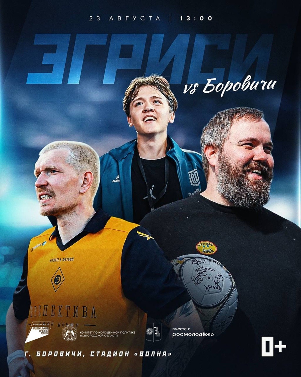 Футбольная команда из Боровичей сыграет матч с игроками российского любительского клуба из Москвы! В эту субботу состоится товарищеский матч: команда города встретится с любительским клубом «Эгриси» из Медийной футбольной лиги. Дата и время: 23 августа в 13:00 Место: стадион «Волна», ул. Подбельского, 57 Вход свободный! #МолодёжНО Мероприятие пройдёт при поддержке Росмолодёжи в рамках инициированной Президентом России программы комплексного развития «Регион для молодых», регионального проекта «Россия - страна возможностей» национального проекта «Молодёжь и дети»