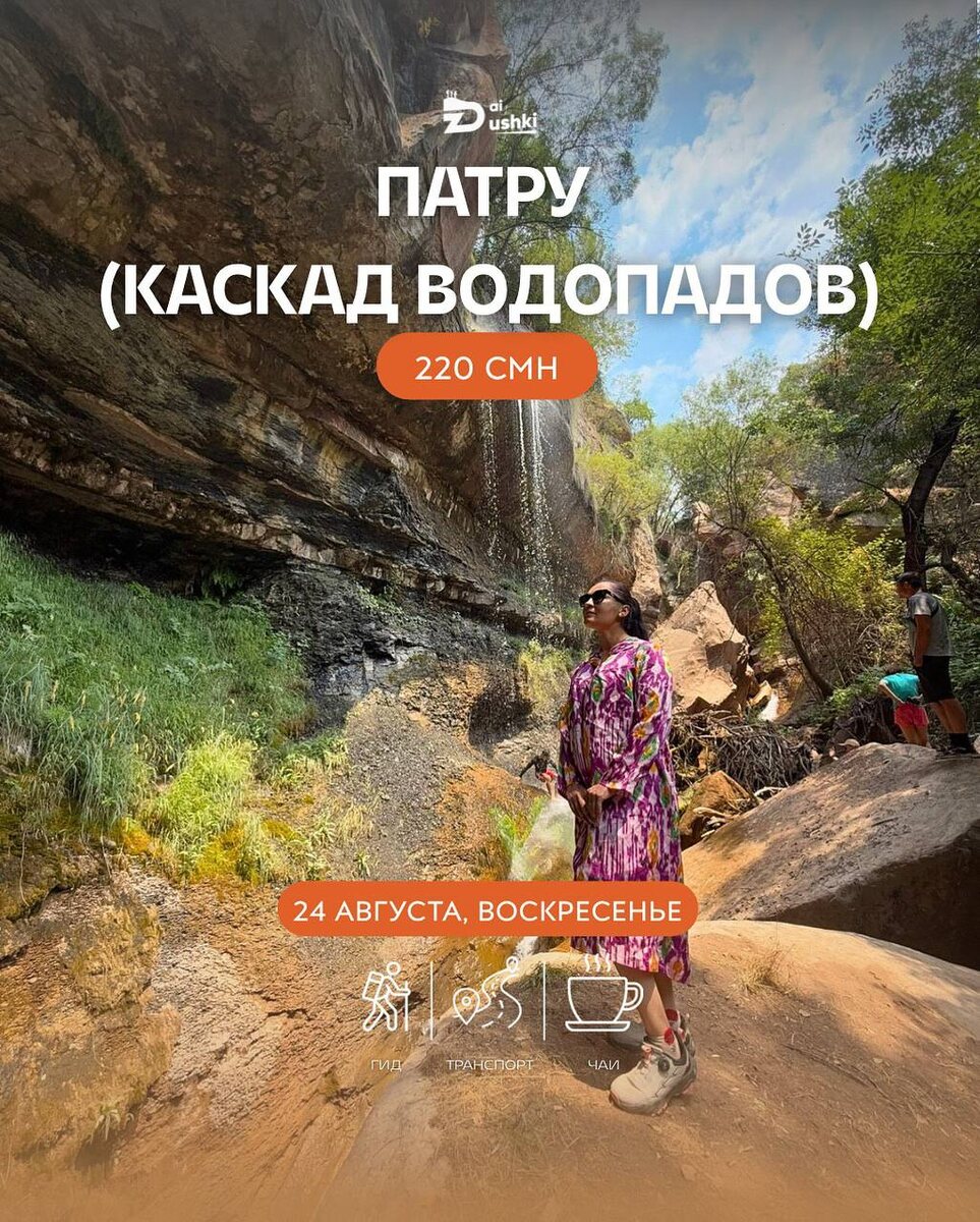 24 августа, вс - Патру (Каскад Водопадов) 🕔 7:00 - 18:00 💺 ДОСТУПНО: 10 мест 🥾 Сложность: 5/10 💳 220 сомони ✅ Включено: транспорт, гид, горячий чай В этот вторник мы отправимся с вами в одно из интересных и немного загадочно сказочных мест, каскадник водопадов в Патру 🌊 Это не просто в прохладное место, а отправимся в приключения идя к водопадам преодолевая водные препятствия. Там же есть два уникальных грота соедененые между собой и покрытые шустым мехом, зеленого мха, превращает этот участок в Бали. Высокие горы, глубокий овраг, в котором скрыты водопады, освежающая вода, удивительные гроты - все это ожидант нас в походе к каскадникам водопада в Патру! 📍Место сбора у Шоколадницы, возле супермаркета Ситора. ☎️ Для записи 989093020 или @daidushki_tours (Telegram) ДайДушки | Подпишись, чтобы не потерять нас