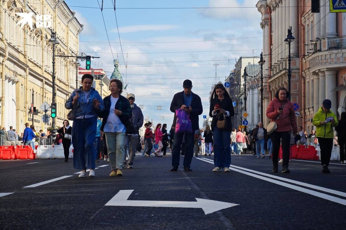 Люди гуляют по солнечному Невскому, где недавно положили асфальт.