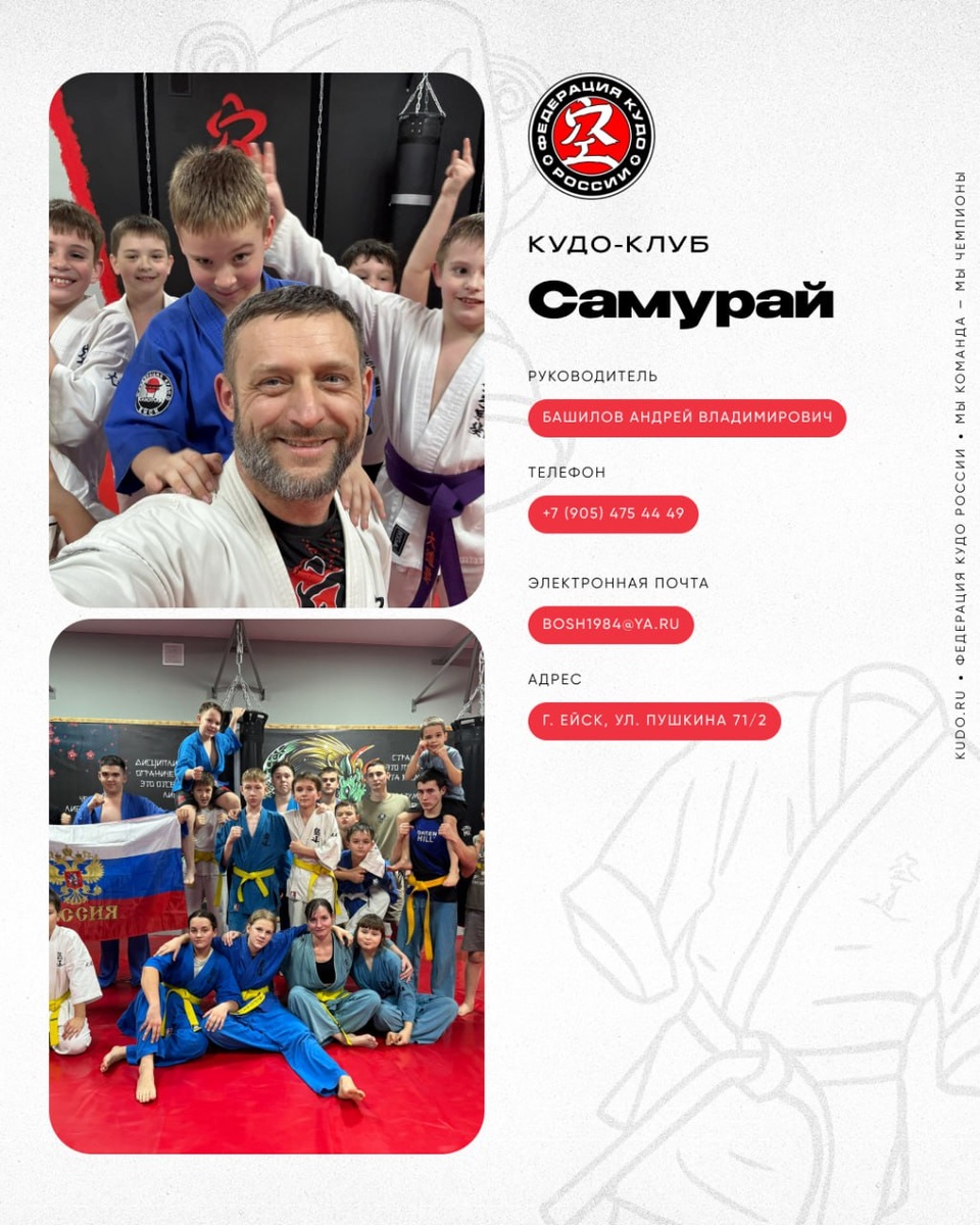 ⛩#КудоКлубы ⠀ Кудо-клуб «Самурай» Клуб основан в мае 2023 года. На сегодняшний день руководитель имеет 3 кю и продолжает свой путь на вершину мастерства. 🥋 Руководитель: Башилов Андрей Владимирович Группы сформированы по возрасту от 4х лет до 30+ Руководитель клуба присоединился к Федерации Кудо и к направлению этого спорта придя из другого единоборства, т.к. по его мнению философия и традиции Кудо сбалансированы и это лучший спорт для самообороны и развития, объединивший в себе лучшее из мира единоборств (ударная техника, броски и борьба) наряду с высокой безопасностью. Клубная атмосфера тренировок постоянно заряжает спортсменов на результат и конечно сменяется регулярными мероприятиями (сборами, походами и праздниками) для укрепления командного духа и привычки быть спортсменом всегда! Добро пожаловать к нам в клуб бесстрашных Самураев! Осс! 📍Адрес: г. Ейск, ул. Пушкина 71/2 Контакты: ✉️ E-mail: bosh1984@ya.ru 📱 Телефон: +79054754449